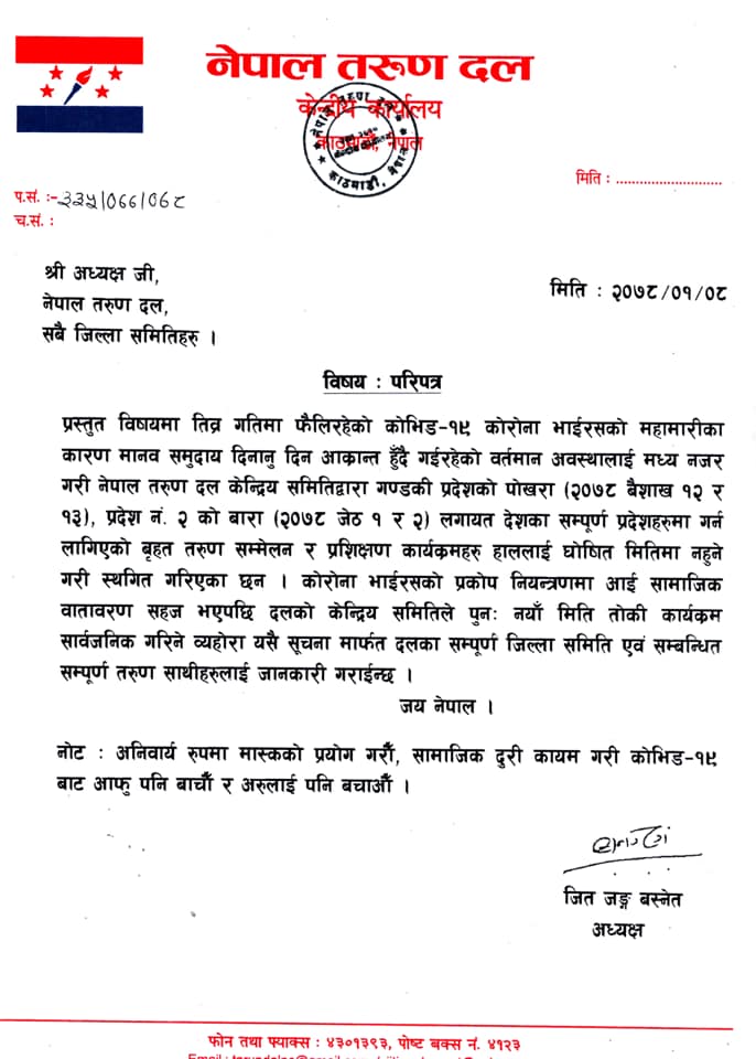 तरुण दलका अध्यक्ष जितजंग बस्नेतले ७७ वटै जिल्लाका अध्यक्षहरूलाई परिपत्र गरेर कोरोना संक्रमण तिब्र गतिमा फैलिरहेको भन्दै तरुण दलका पूर्व निधारित कार्यक्रमहरू स्थगित गर्ने निर्णय गरेको जनाएका छन् ।