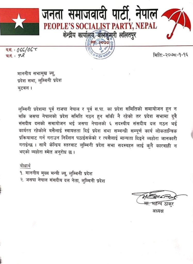 ‘लम्बिनी प्रदेशमा पूर्वराजपा नेपाल र पूर्व सपाका प्रदेश समितिको समायोजन हुन र नसकी जसपा नेपालको प्रदेश समिति गठन हुन बाँकी नै रहेको तर, प्रदेश सभामा दुबै संसदीय दलको समायोजना भई जसपा नेपाको ६ सदस्यीय संसदीय दल गठन भाई कार्यरत रहेकोले यसैलाई स्वायत्तता दिइ प्रदेश सभासम्बन्धी सम्पूर्ण कार्य लोकतान्त्रिक प्रक्रियाबाट गर्न गराउन निर्देशन पठाइएको र त्यसैलाई मान्यता दिइने व्यहोरा जानकारी गराइन्छ’, पत्रमा ठाकुरले भनेका छन्, ‘केन्द्रीयस्तरबाट लुम्बिनी प्रदेश सभा सदस्यहरूलाई कुनै कारबाही नभएको व्यहोरा समेत अनुरोध छ ।’