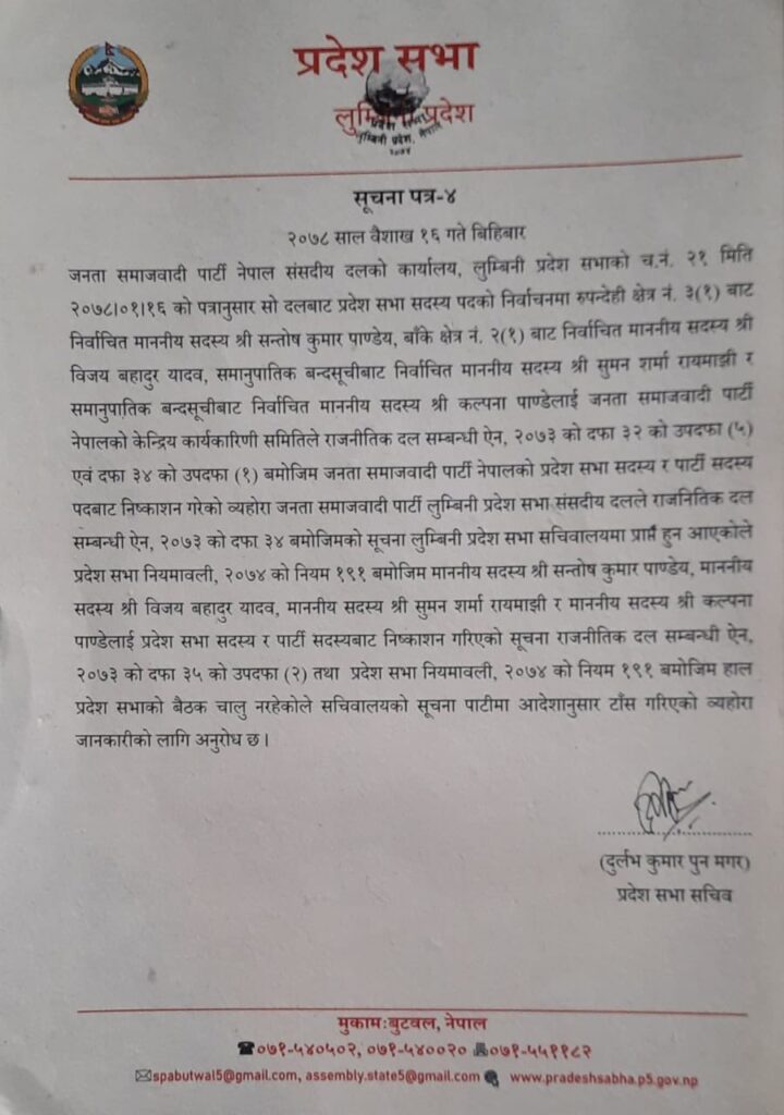 बिहीबार जसपाका प्रदेश सभा सचिव दुर्लभकुमार पुन मगरले सूचना पत्र– ४ जारी गरेर सांसदहरू सन्तोषकुमार पाण्डेय, विजयबहादुर यादव, सुमन शर्मा रायमाझी र कल्पना पाण्डेलाई निष्काशन गरिएको सूचना टाँस गरिएको जनाएका छन् ।