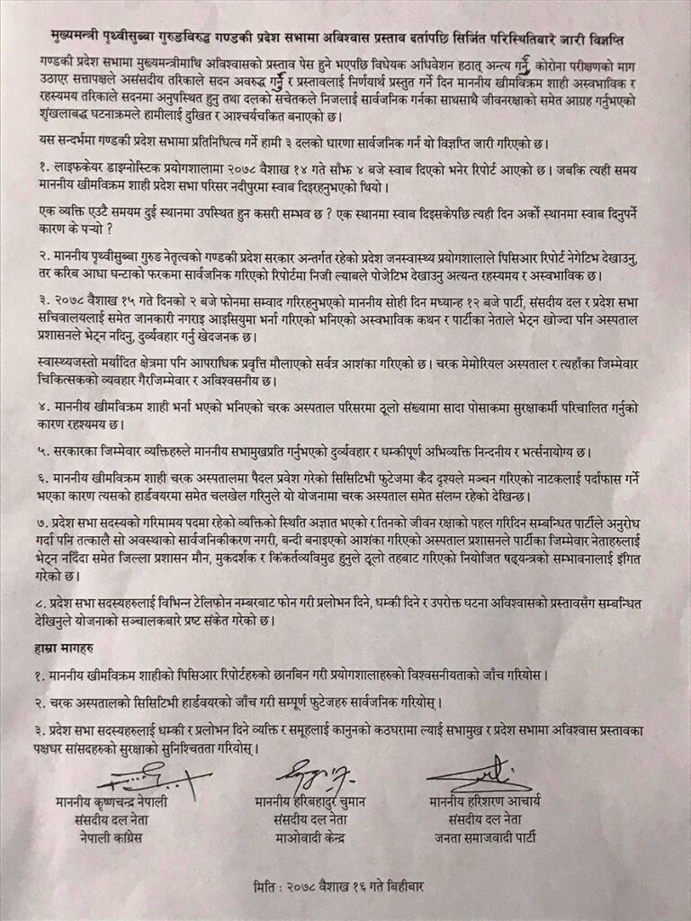 नेपाली कांग्रेस संसदीय दलका नेता कृष्णचन्द्र नेपाली, माओवादी केन्द्रका संसदीय दलका नेता हरिबहादुर चुमान र जनता समाजवादी पार्टीका संसदीय दलका नेता हरिचरण आचार्यले विज्ञप्तिमा हस्ताक्षर गरेका छन । उनीहरूले पीसीआर रिपोर्टको छानबिन गरी प्रयोगशालाहरूको विश्वसनीयताको जाँच गर्न माग गरेका हुन् ।