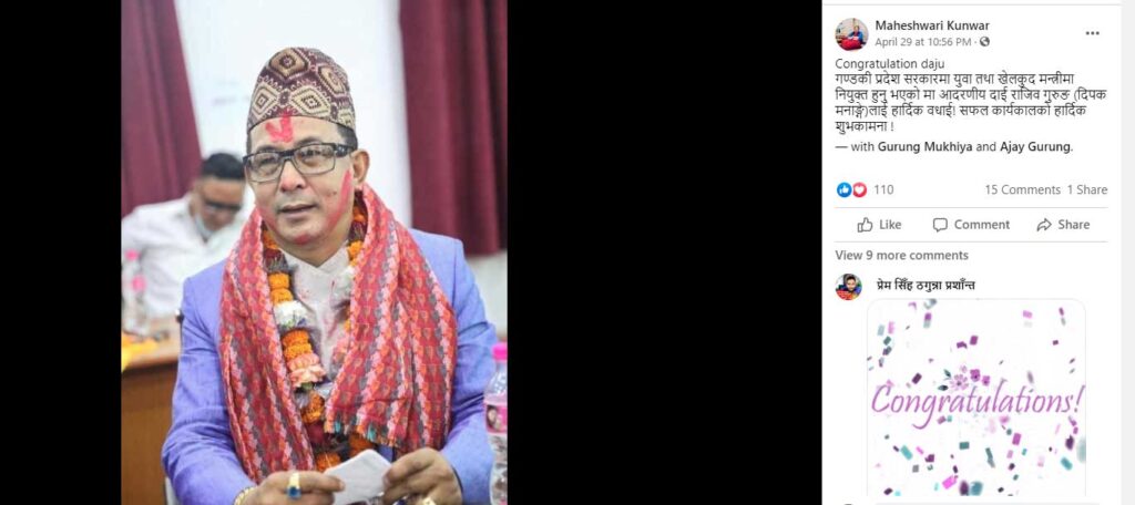 ‘गण्डकी प्रदेश सरकारमा युवा तथा खेलकुद मन्त्रीमा नियुक्त हुनु भएकोमा आदरणीय दाई राजिव गुरुङ (दीपक मनाङ्गे)लाई हार्दिक बधाई’, नेविसंघकी महामन्त्री कुँवरले भनेकी छिन्, ‘सफल कार्यकालको हार्दिक शुभकामना ।’