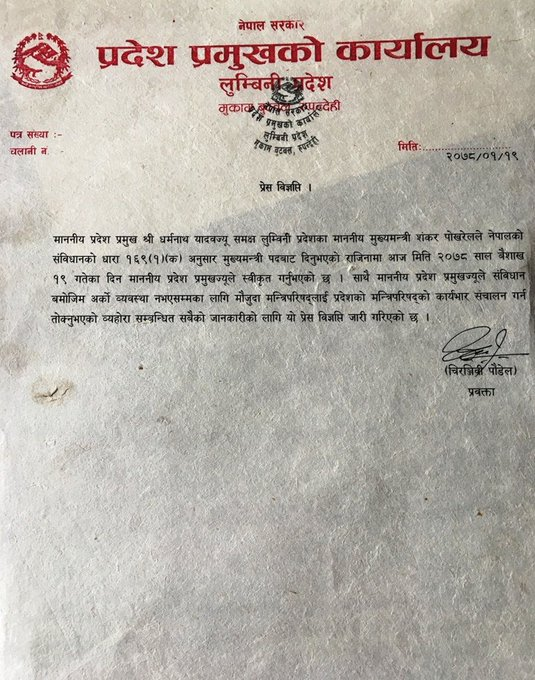 बुटवल । लुम्बिनी प्रदेशका प्रमुख धर्मनाथ यादवले मुख्यमन्त्री शंकर पोखरेलको राजीनामा स्वीकृत गरेका छन् ।