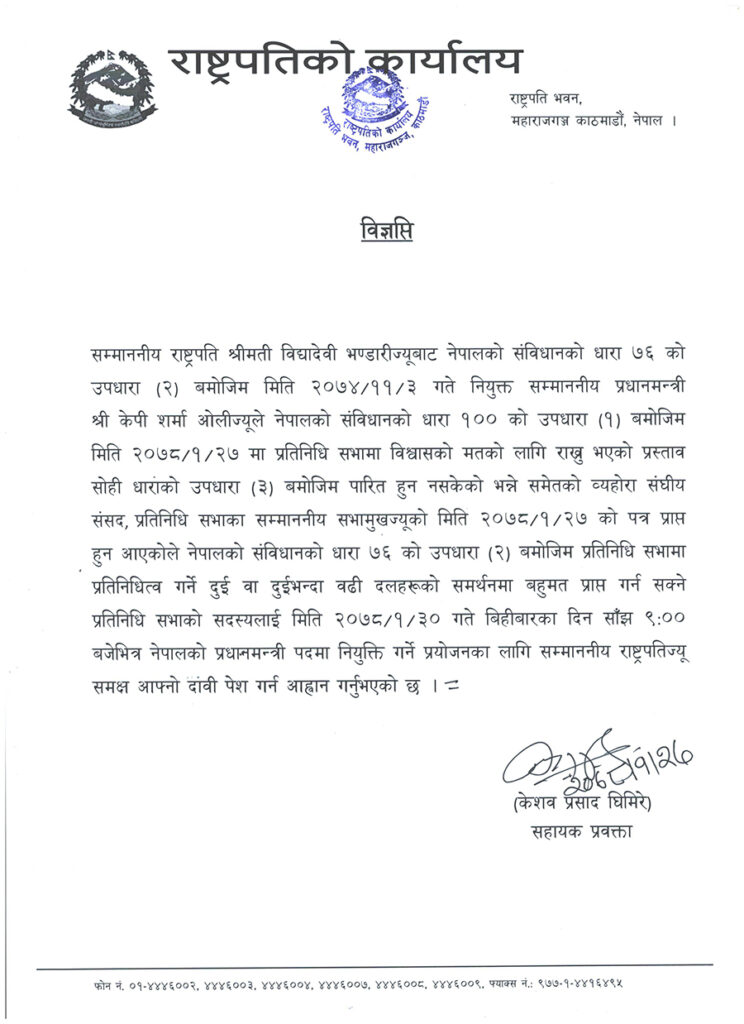 ‘राष्ट्रपति विद्यादेवी भण्डारीले नेपालको संविधानको धारा ७६ को उपधारा (२) बमोजिम प्रतिनिधि सभामा प्रतिनिधित्व गर्ने दुई वा दुईभन्दा बढी दलहरूको समर्थनमा बहुमत प्राप्त गर्न सक्ने प्रतिनिधि सभाको सदस्यलाई वैशाख ३० गतेभित्र नेपालको प्रधानमन्त्री पदमा नियुक्ति गर्ने प्रयोजनका लागि आफ्नो दाबी पेश गर्न आह्वान गर्नुभएको छ’, विज्ञप्तिमा भनिएको छ ।