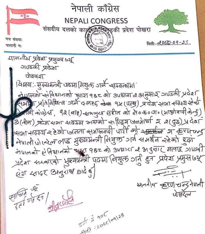 बुधबार कांग्रेसका सांसदीय दलका नेता कृष्णचन्द्र नेपाली पोखरेलले आफूलाई मुख्यमन्त्री नियुक्त गर्न आग्रह गरेर प्रदेश प्रमुख सीता पौडेलाई पत्र लेखेर दर्ता गराएका हुन् ।