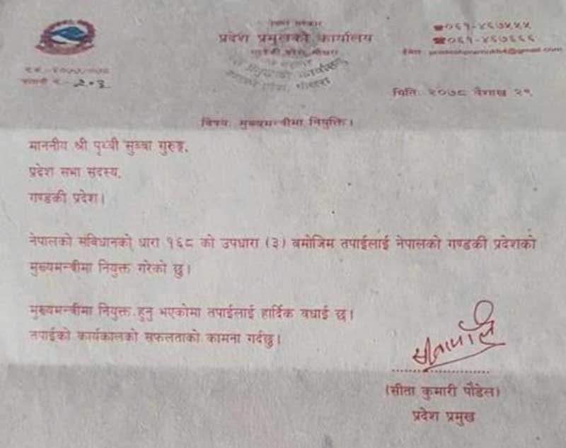 कांग्रेसका पोखरेलले प्रदेशसभाका चार दलको समर्थन रहेको पत्र बुधबार प्रदेश प्रमुखको कार्यालयमा दर्ता गराएका थिए । तर, प्रदेश प्रमुख पौडेलले मुख्यमन्त्रीको रूपमा गुरूङलाई पुनः नियुक्त गरेकी छिन् ।
