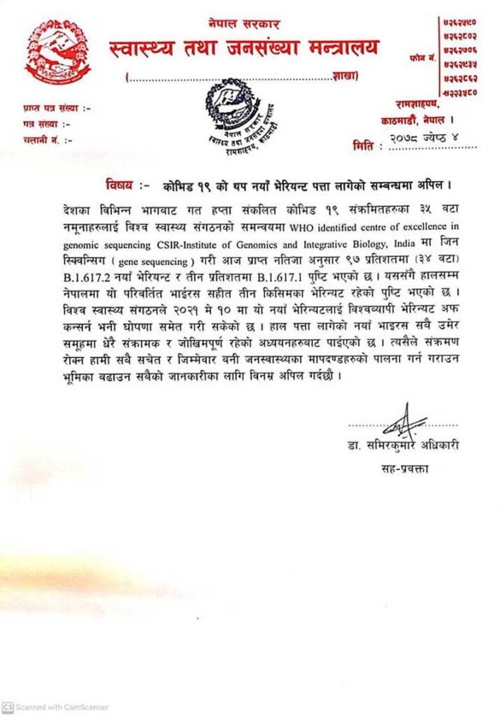 स्वास्थ्य मन्त्रालयका सह–प्रवक्ता डा.समिरकुमार अधिकारीले मंगलबार विज्ञप्ति जारी गरेर नेपालमा कोरोनाको नयाँ भेरियन्ट पत्ता लागेको बताए ।