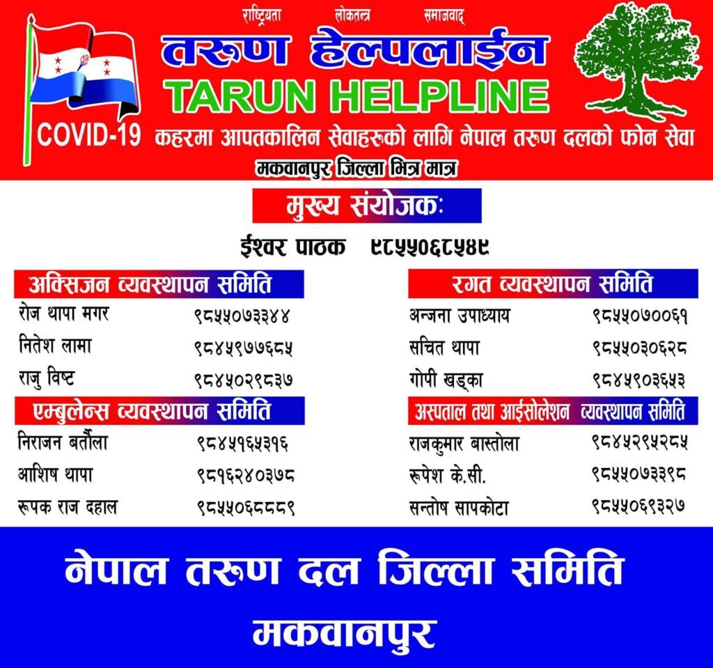 एमाले र कम्युनिस्टहरू तथा महन्थ ठाकुर–राजेन्द्र महतो समूह खड्गप्रसाद ओलीको सत्ता जोगाउन सांसदहरूलाई रिसोर्टमा लगेर भोज खुवाउने कार्य गरिरहेका बेला तरुण दल मकवानपुरले कोरोनामा सहयोगका लागि समिति बनाएर फोन नम्बरहरू सार्वजनिक गरेको छ ।
