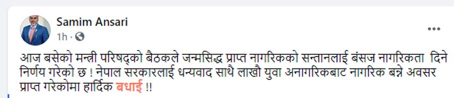 ‘आज बसेको मन्त्रिपरिषदको बैठकले जन्मसिद्ध प्राप्त नागरिकको सन्तानलाई बंशज नागरिकता दिने निर्णय गरेको छ’, आयोगका अध्यक्ष अन्सारीले फेसबुकमा लेखेका छन्, ‘नेपाल सरकारलाई धन्यवाद साथै लाखौ युवा अनागरिकबाट नागरिक बन्ने अवसर प्राप्त गरेकोमा हार्दिक बधाई ।’