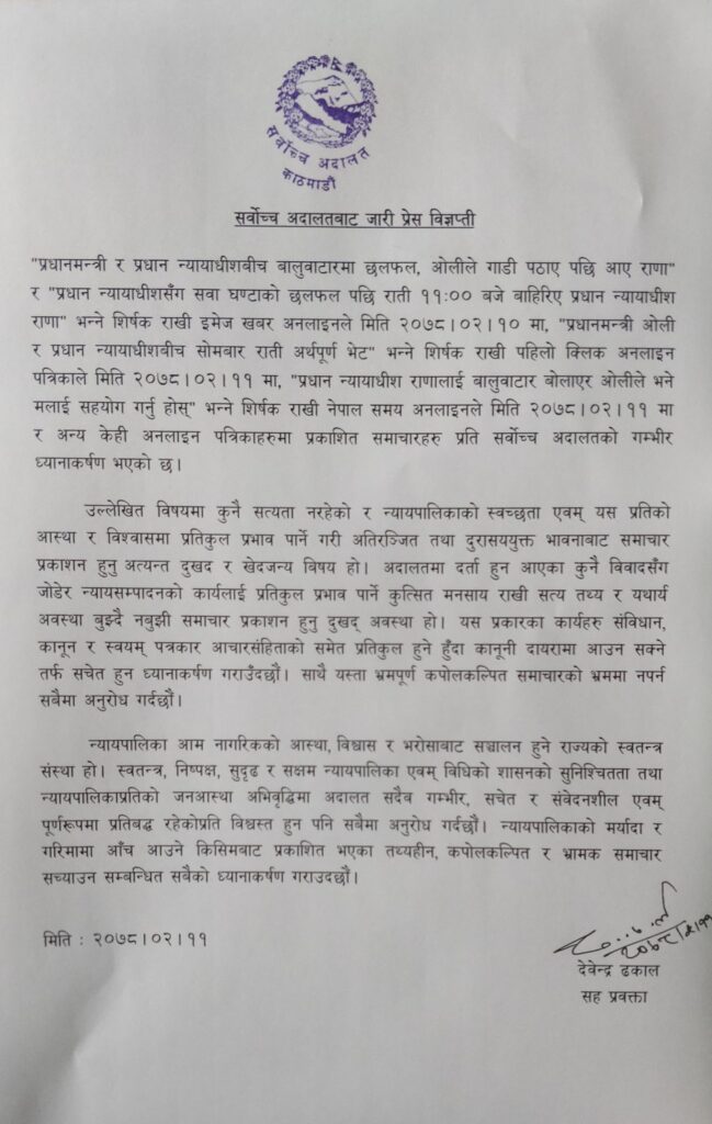 ‘उल्लेखित विषयमा कुनै सत्यता नरहेको र न्यायपालिकाको स्वच्छता एवम् यसप्रतिको आस्था र विश्सामा प्रतिकूल प्रभाव पर्ने गरि अतिरञ्जित तथा दुरासययुक्त भावनाबाट समाचार प्रकाशन हुनु अत्यन्त दुखद् र खेदजन्य विषय हो’, विज्ञप्तिमा भनिएको छ, ‘अदालतमा दर्ता हुन आएका कुनै विवादसँग जोडेर न्यायसम्पादनको कार्यलाई प्रतिकूल प्रभाव पर्ने कुत्सित मनसाय राखी सत्य तथ्य र यथार्य अवस्था बुझ्दै नबुझी समाचार प्रकाशन हुनु दुखद् अवस्था हो ।’