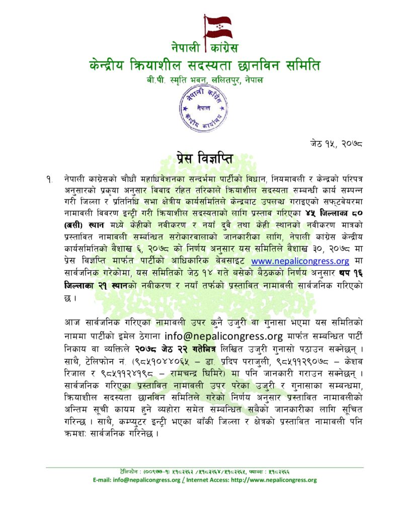 सार्वजनिक गरिएका प्रस्तावित नामावली उपर परेका उजुरी र गुनासाका सम्बन्धमा, क्रियाशील सदस्यता छानविन समितिले गरेको निर्णयानुसार प्रस्तावित नामावलीको अन्तिम सूची कायम हुने कांग्रेसले जनाएको छ । बाँकी रहेका जिल्ला र स्थानको क्रियाशील सदस्यता नवीकरण र नयाँ सदस्यताका लागि क्रमशः सार्वजनिक गरिनेछ ।