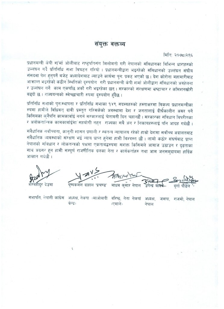 कांग्रेस सभापति शेरबहादुर देउवाको बुढानिलकण्डस्थित निवासमा आइतबार बसेको पाँच दलका शीर्ष नेताहरूको बैठकले राज्यका सबै अंग र निकायहरूलाई ओलीको संविधान विपरितको अलोकतान्त्रिक कामकारबाहीमा सहयोग नबन्न राज्यका सबै अंग र निकायहरूलाई आग्रह गरेको हो ।