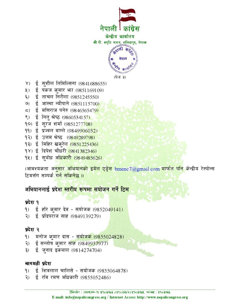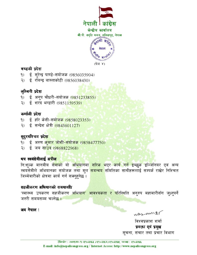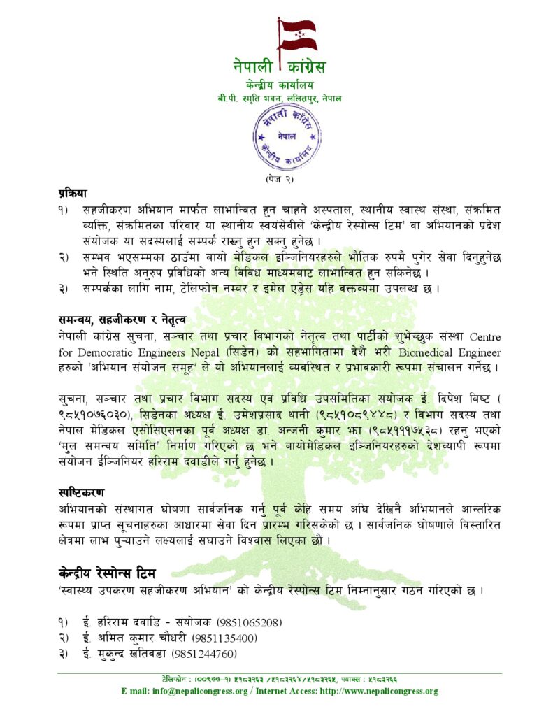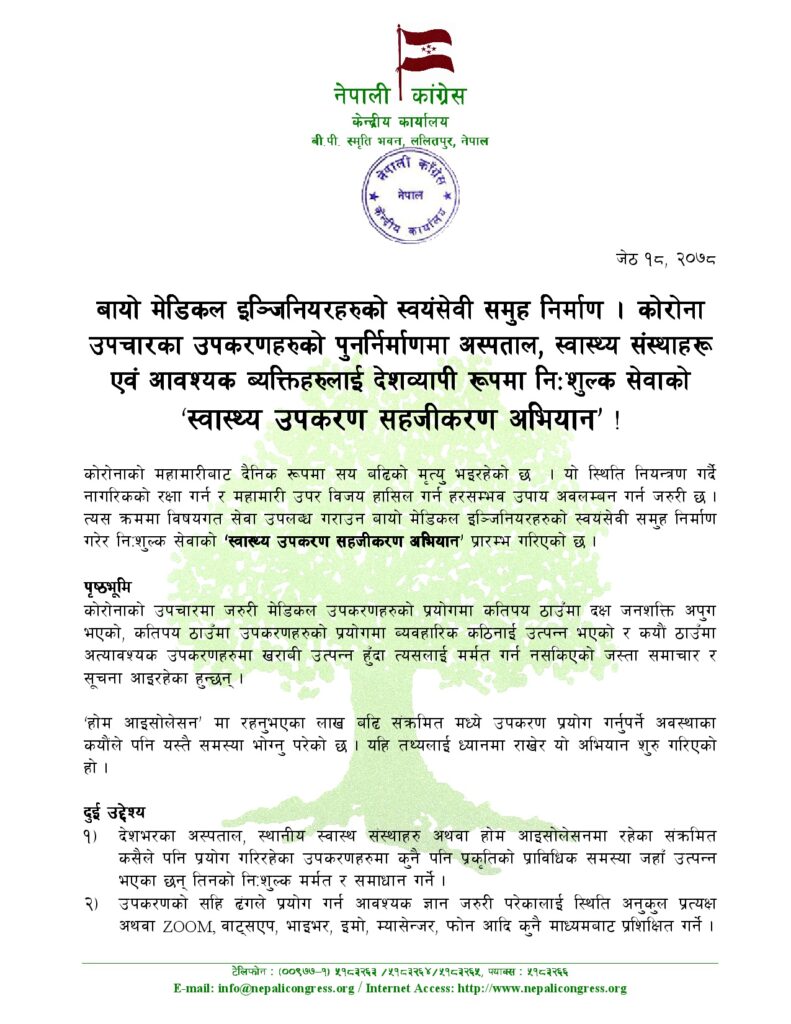 त्यस क्रममा विषयगत सेवा उपलब्ध गराउन बायो मेडिकल इञ्जिनियरहरूको स्वयंसेवी समूह निर्माण गरेर निःशुल्क सेवाको ‘स्वास्थ्य उपकरण सहजीकरण अभियान’ प्रारम्भ गरिएको कांग्रेसले जनाएको छ ।