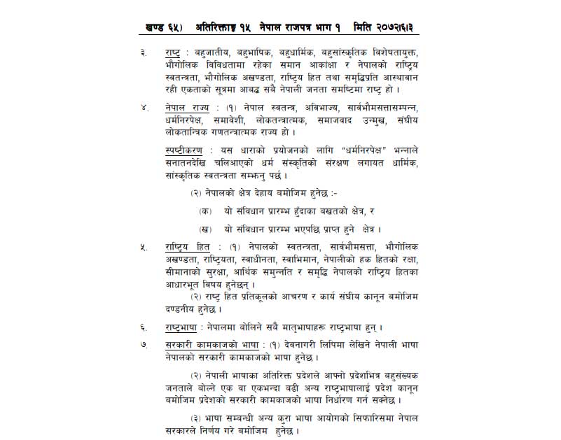 राष्ट्र : बहुजाीय, बहुभाषिक, बहुधार्मिक, बहुसांस्कृतिक विशेषतायुक्त भौगोलिक विविधितामा रहका समान आकांक्षा र नेपालको राष्ट्रिय स्वतन्त्रता, भौगोलिक अखण्डता, भौगोलिक अखण्डता, राष्ट्रिय हित तथा समृद्धिप्रति आस्थावान रही एकताको सूत्रमा आबद्ध सबै नेपाली जनता समष्टिमा राष्ट्र हो ।