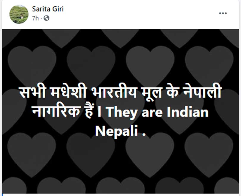 शनिबार गिरीले आफ्नो फेसबुकमा स्टाटस लेखेर भनेकी छिन्, ‘सभी मधेशी भारतीय मूल के नेपाली नागरिक हैं ।’ उनको यो अभिव्यक्तिले मधेशी नगारिकहरूको अपमान भएको भनेर कमेन्टहरू आएका छन् ।