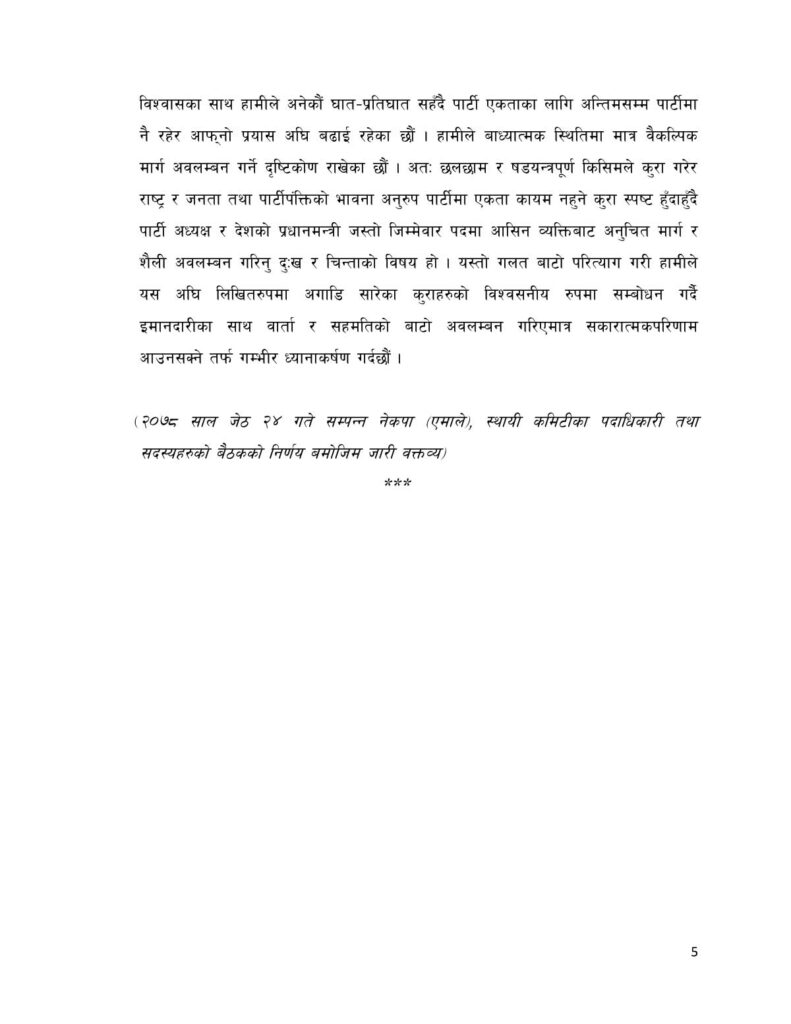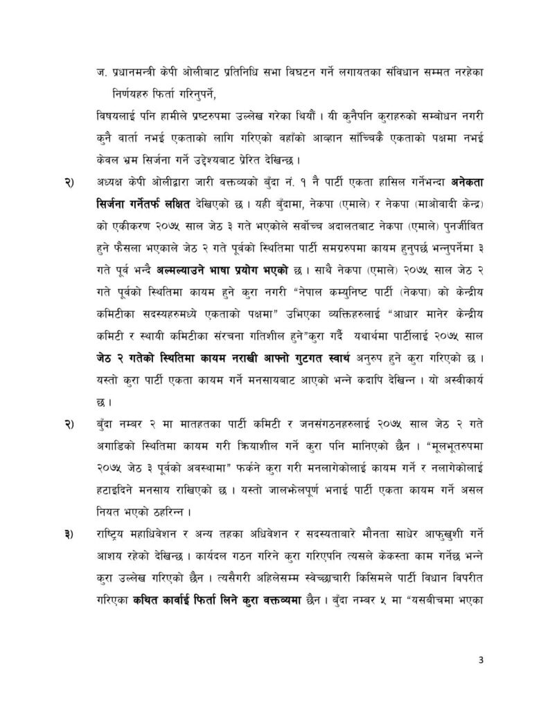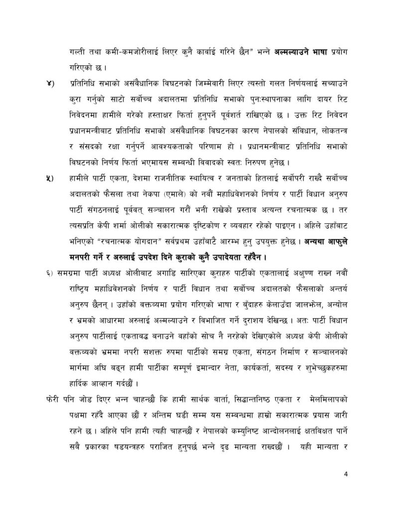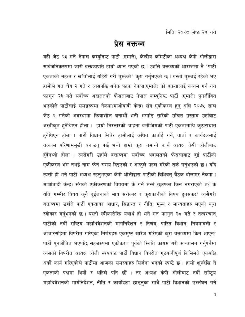 ‘अध्यक्ष केपी ओलीद्वारा जारी वक्तव्यको बुँदा नम्बर १ नै पार्टी एकता हासिल गर्नेभन्दा अनेकता सिर्जना गर्नेतर्फ लक्षित देखिएको छ । यही बुँदामा एमाले र माओवादी केन्द्रको एकीकरण २०७५ साल जेठ ३ गते भएकोले सर्वोच्च अदालतबाट एमाले पुनर्जीवित हुने फैसला भएकाले जेठ २ गते पूर्वको स्थितिमा पार्टी समग्ररुपमा कायम हुनुपर्छ भन्नुपर्नेमा ३ गते पूर्व भन्दै अल्मल्याउने भाषा प्रयोग भएको छ’, विज्ञप्तिमा भनिएको छ ।