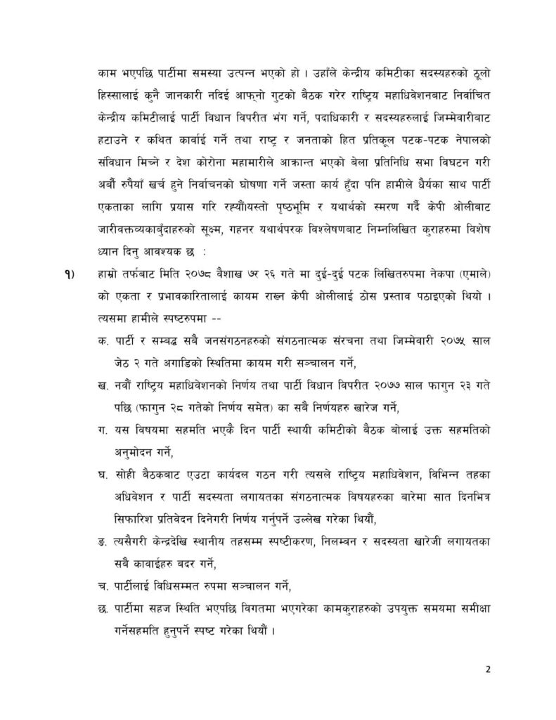 प्रस्तावमा पार्टी र सम्बद्ध सबै जनसंगठनहरूको संगठनात्मक संरचना तथा जिम्मेवारी २०७५ साल जेठ २ गते अगाडिको स्थितिमा कायम गरी सञ्चालन गर्ने, प्रतिनिधि सभा विघटनको निर्णय फिर्ता लिनुपर्ने, नेताहरूमाथि भएको कारबाही फिर्ता लिनुपर्ने विषय उठाइएको वक्तव्यमा उल्लेख छ ।