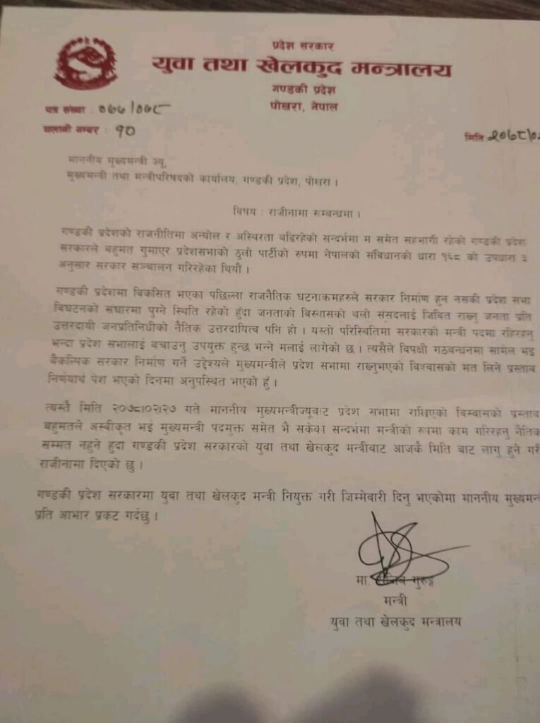 काठमाडौं । गण्डकी प्रदेशका कम्युनिस्ट मुख्यमन्त्री पृथ्वीसुब्बा गुरुङको सरकार ढल्नेवित्तिकै युवा तथा खेलकुदमन्त्री राजिव गुरुङ उर्फ दीपक मनाङेले पदबाट राजीनामा दिएका छन् ।