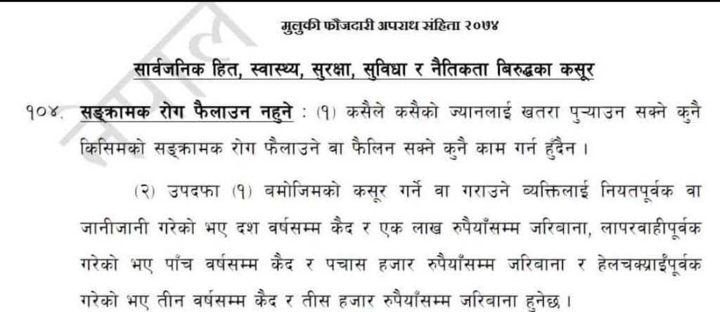 मुलुकी फौजदारी अपराध संहिता २०७४ मा कसैको ज्यानलाई खतरा पुर्याउन सक्ने कुनै किसिमका संक्रामक रोग फैलाउने वा फैलन सक्ने कुनै पनि काम गर्न नहुने व्यवस्था रहेको छ ।