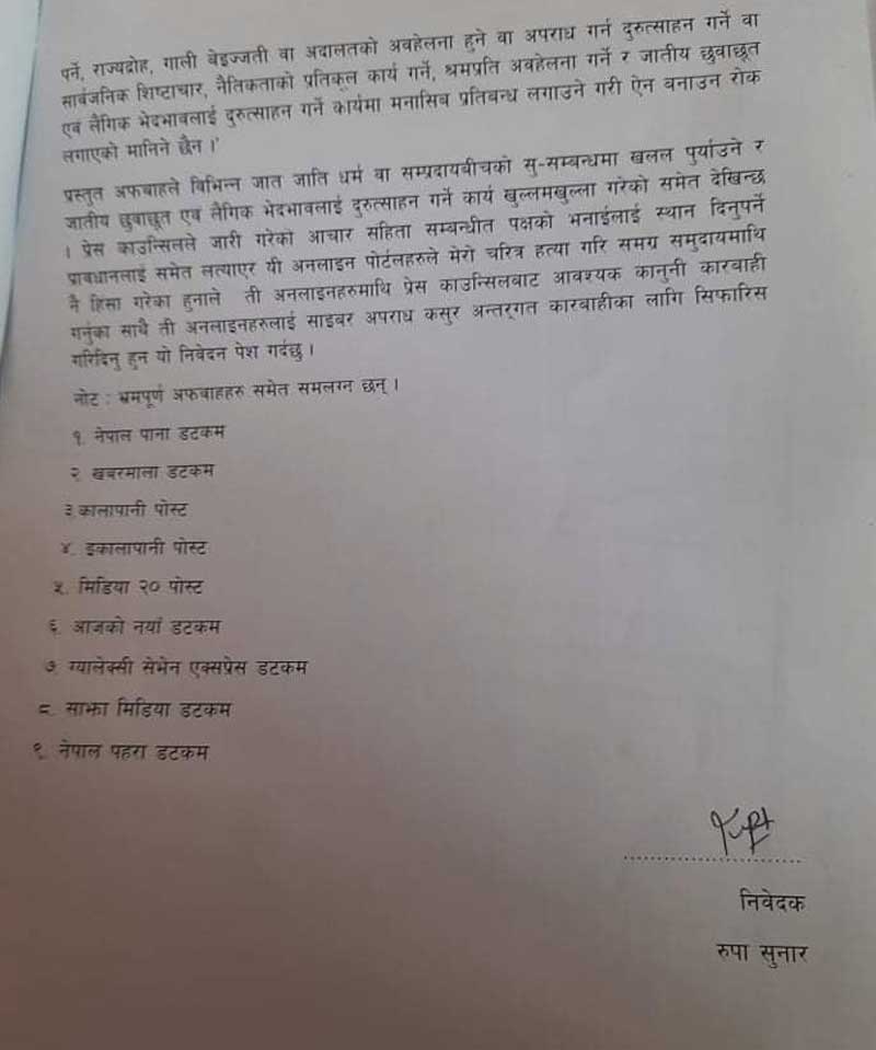 ‘प्रस्तुत अफवाहले विभिन्न जात, जाति, धर्म वा सम्प्रदायबीचको सु–सम्बन्धमा खलल पु¥याउने र जातीय छुवाछुत एवम् लैंगिक भेदभावलाई दुरुत्साहन गर्ने कार्य खुल्लमखुल्ला गरेको समेत देखिन्छ’, उजुरीमा भनिएको छ, ‘प्रेस काउन्सिलले जारी गरेको आचारसंहिता सम्बन्धित पक्षको भनाइलाई स्थान दिनुपर्ने प्रावधानलाई समेत लत्याएर यी अनलाईनहरू मेरो चरित्र हत्या गरि समग्र समुदायमाथि नै हिंसा गरेको हुनाले ती अनलाईनहरूमाथि प्रेस काउन्सिलबाट आवश्यक कानूनी कारबाही गर्नुका साथै ती अनलाईनर्लाइ साइबर अपराध कसुर अन्तर्गत कारबाहीका लागि सिफारिस गरिदिनुहुन यो निवेदन पेश गर्दछु’, पीडित सुनारले भनेकी छिन् ।