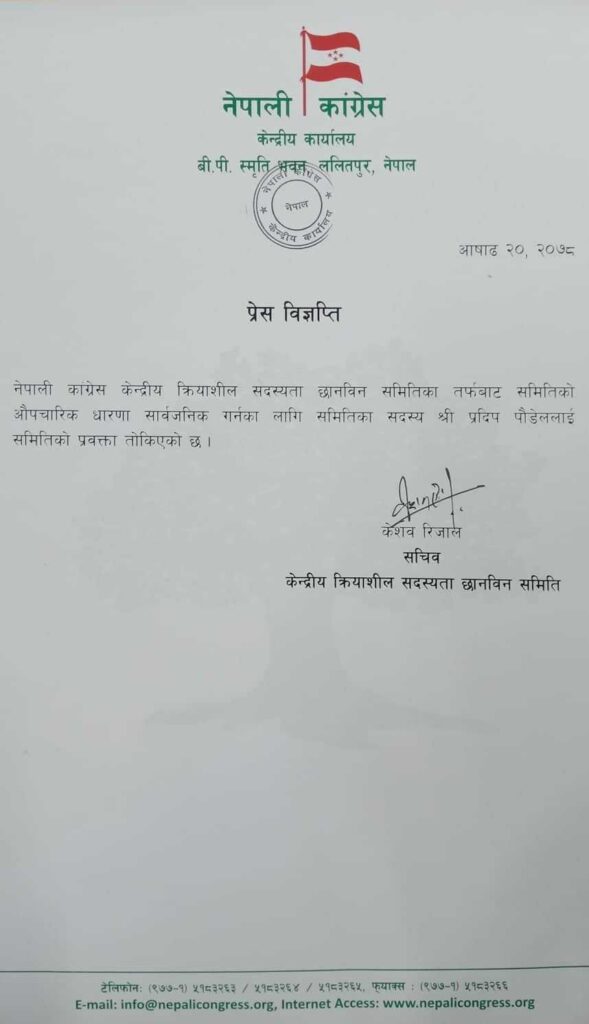 ‘नेपाली कांग्रेस केन्द्रीय क्रियाशील सदस्यता छानविन समितिका तर्फबाट समितिको औपचारिक धारणा सार्वजनिक गर्नका लागि समितिका सदस्य प्रदीप पौडेललाई समितिको प्रवक्ता तोकिएको छ’, विज्ञप्तिमा भनिएको छ ।