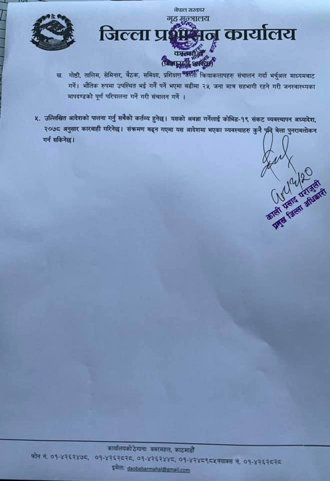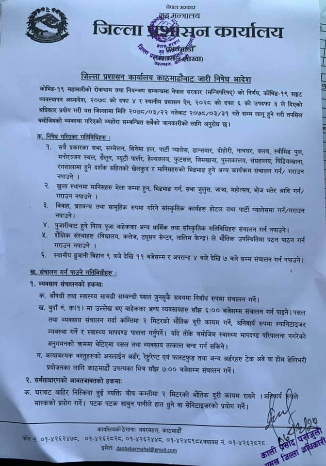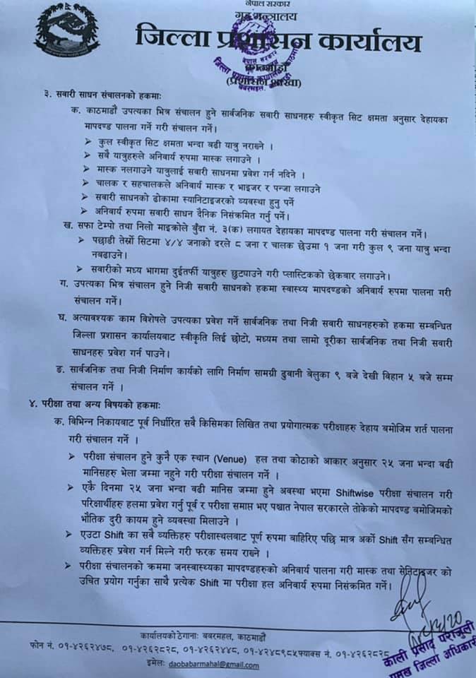 अत्यावश्यक काम विशेषले उपत्यका प्रवेश गर्ने सार्वजनिक तथा निजी सवारी साधनहरूको हकमा सम्बन्धित जिल्ला प्रशासन कार्यालयबाट स्वीकृति लिएर छोटो, मध्यम तथा लामो दूरीका सार्वजनिक तथा निजी सवारी साधनहरू प्रवेश गर्न पाउनेछन् ।