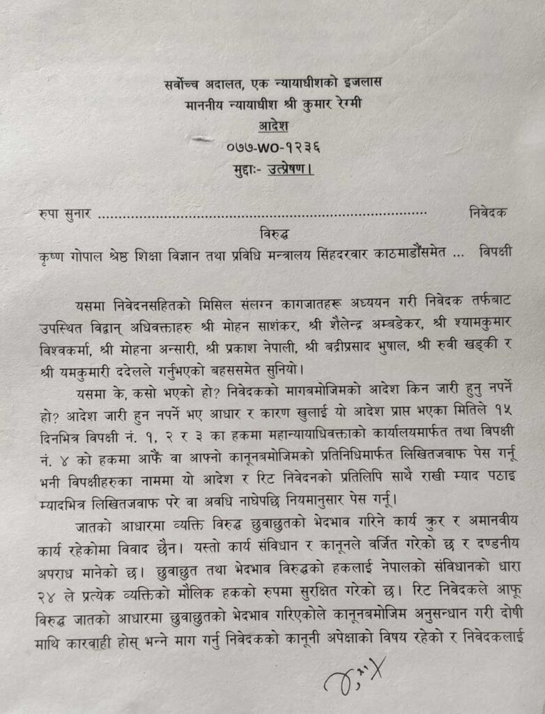 काठमाडौं । रुपा सुनुवारद्वारा दायर गरिएको रिटमा सर्वोच्च अदालतले एमालेका नेता समेत रहेका शिक्षा, विज्ञान तथा प्रविधिमन्त्री कृष्णगोपाल श्रेष्ठसँग लिखित जवाफ माग गरेको छ ।
