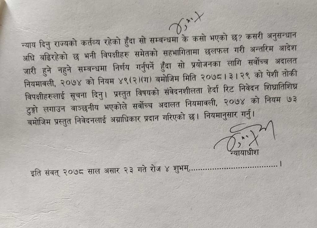 सर्वोच्च अदालतले मन्त्री श्रेष्ठसहितका विपक्षीसँग लिखित जवाफ माग गरेको छ । सर्वोच्च अदालतले मुद्दालाई शीघ्र टुंगो लगाउनुपर्ने भन्दै अग्राधिकार दिन अदेश दिएको छ ।