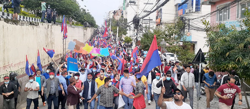 काठमाडौं । कम्युनिस्ट कामचलाउ सरकारका प्रधानमन्त्री खड्गप्रसाद ओलीको समर्थनमा एमालेको भ्रातृ संगठन राष्ट्रिय युवा संघ नेपालले स्वाथ्य मापदण्ड उल्लंघन गरेर काठमाडौंमा प्रदर्शन गरेको छ ।