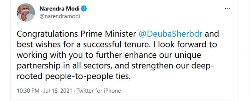 भारतीय प्रधानमन्त्री मोदीले प्रधानमन्त्री देउवालाई बधाई दिँदै सफल कार्यकालको शुभकामना व्यक्त गरेका छन् ।