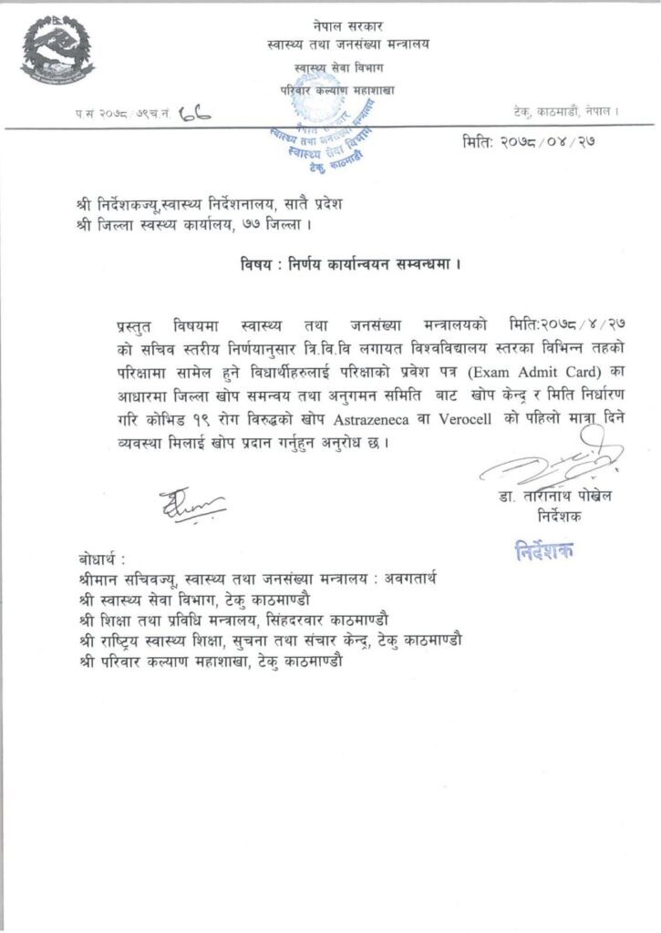 खोप लगाउन परीक्षार्थीले परीक्षाको प्रवेश पत्र देखाउनुपर्नेछ । स्वास्थ्य सेवा विभागका निर्देशक डा.तारानाथ पोखरेलले सातै प्रदेश र ७७ वटा जिल्लालाई परिपत्र गरेर त्रिविका परीक्षार्थीलाई कोरोनाविरुद्धको खोप दिन भनेका हुन् ।