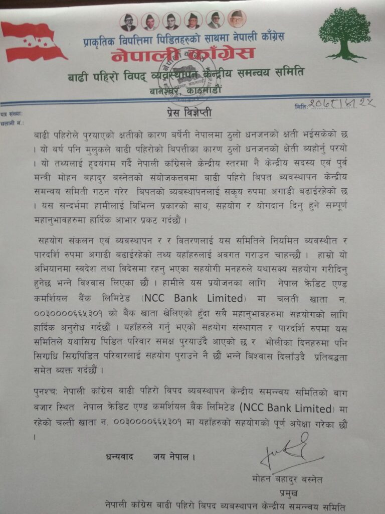 कांग्रेसका केन्द्रीय सदस्य एवम् समितिका संयोजक मोहनबहादुर बस्नेतले विज्ञप्ति जारी गरेर बाढीपहिरो र विपतमा परेकाहरू उद्धार तथा राहतमा जोडिन सबैमा आग्रह गरेका छन् ।