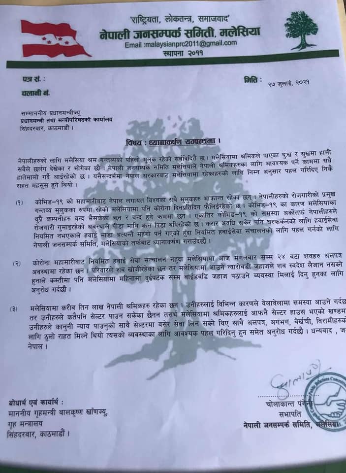 ‘कोभिड–१९ को महामारीबाट नेपाल लगायत विश्वका सबै मुलुकहरू आक्रान्त रहेका छन् । नेपालीहरूको रोजगारीको प्रमुख गन्तव्य मुलुकका रुपमा रहेको मलेसियामा पनि कोरोना दिन प्रतिदिन फैलिरहेको छ’, पत्रमा भनिएको छ ।