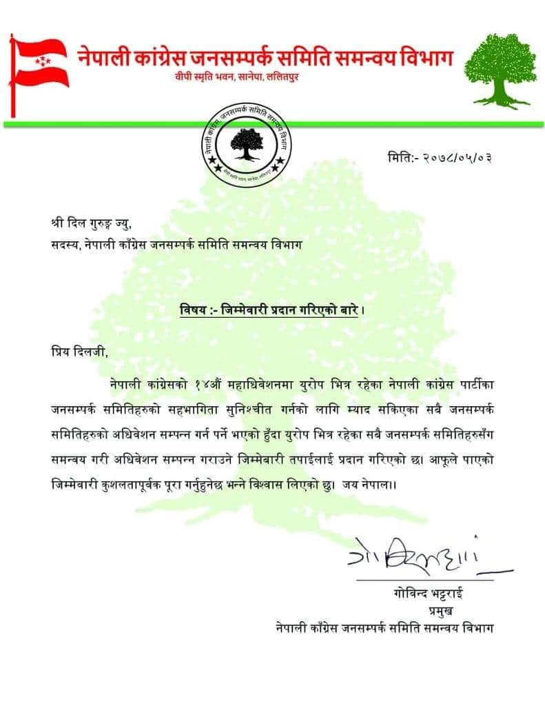 ‘नेपाली कांग्रेसको १४औँ महाधिवेशनमा युरोपभित्र रहेका नेपाली कांग्रेस पार्टीका जनसम्पर्क समितिहरूको सहभागिता सुनिश्चित गर्नको लागि म्याद सकिएका सबै जनसम्पर्क समितिहरूको अधिवेशन सम्पन्न गर्न पर्ने भएको हुँदा युरोपभित्र रहका सबै जनसम्पर्क समितिहरूसँग समन्वय गरि अधिवेशन सम्पन्न गराउने जिम्मेवारी ताईलाई प्रदान गरिएको छ’, पत्रमा उल्लेख छ ।