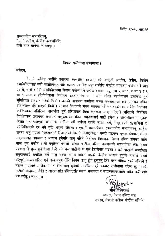 ‘वर्तमान विधानको गलत ब्याख्या गर्दै बनाइएको असमावेशी निर्वाचन निर्देशिकाका अतिक्ति जालझेलपूर्ण तरिकाबाट विना छलफल लागू गरिएको भनिएको निर्वाचन निर्देशिकाले उपत्यका लगायत मुलुकभरिका दलित समुदायलाई पार्टी प्रवेश र प्रतिनिधित्वमा पूर्णतः निषेध गर्ने देखिन्छ’, विश्वकर्माले राजीनामा पत्रमा उल्लेख गरेका छन् ।