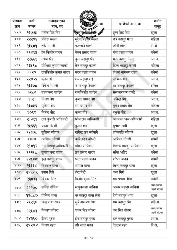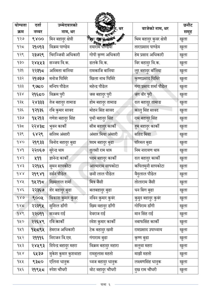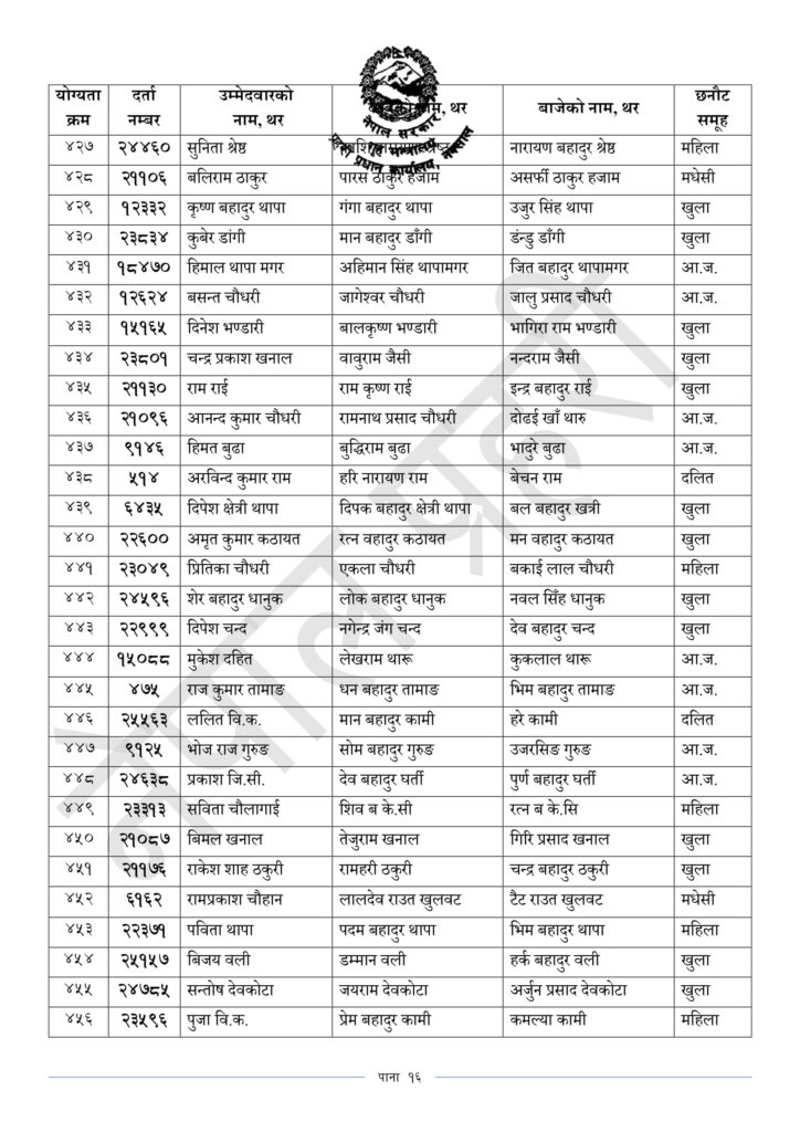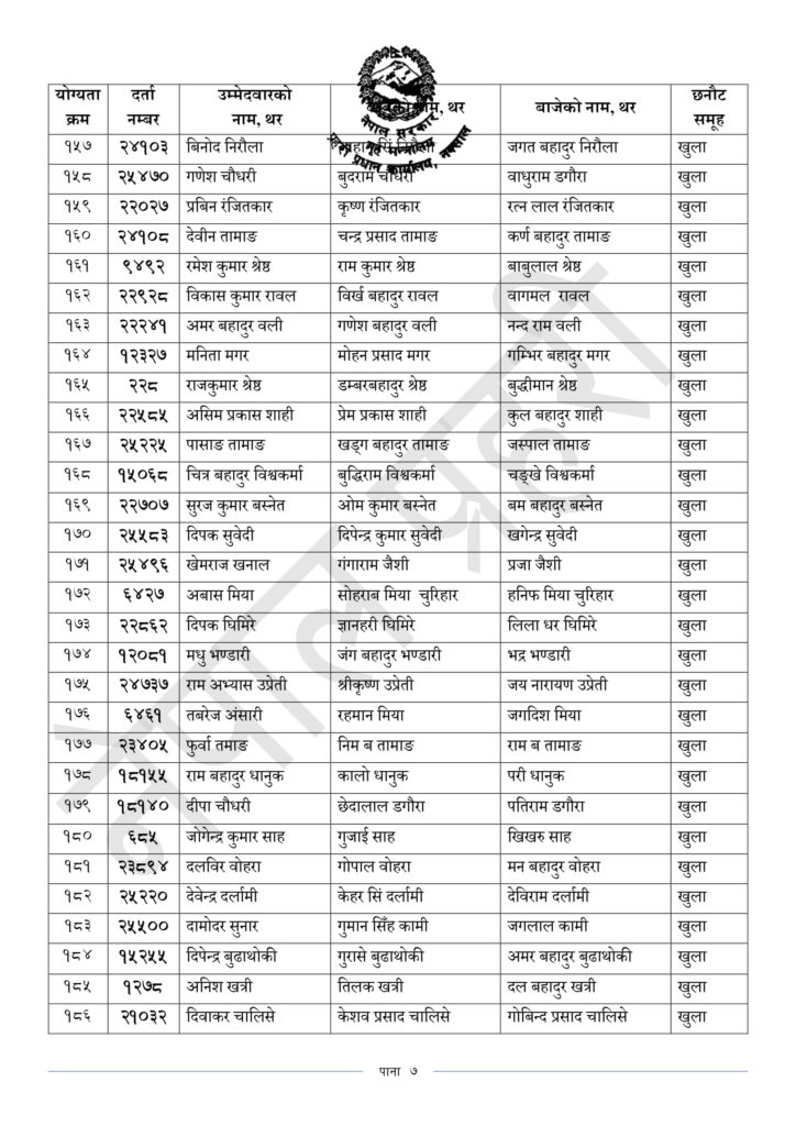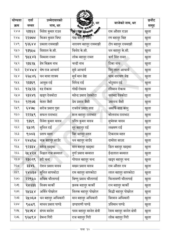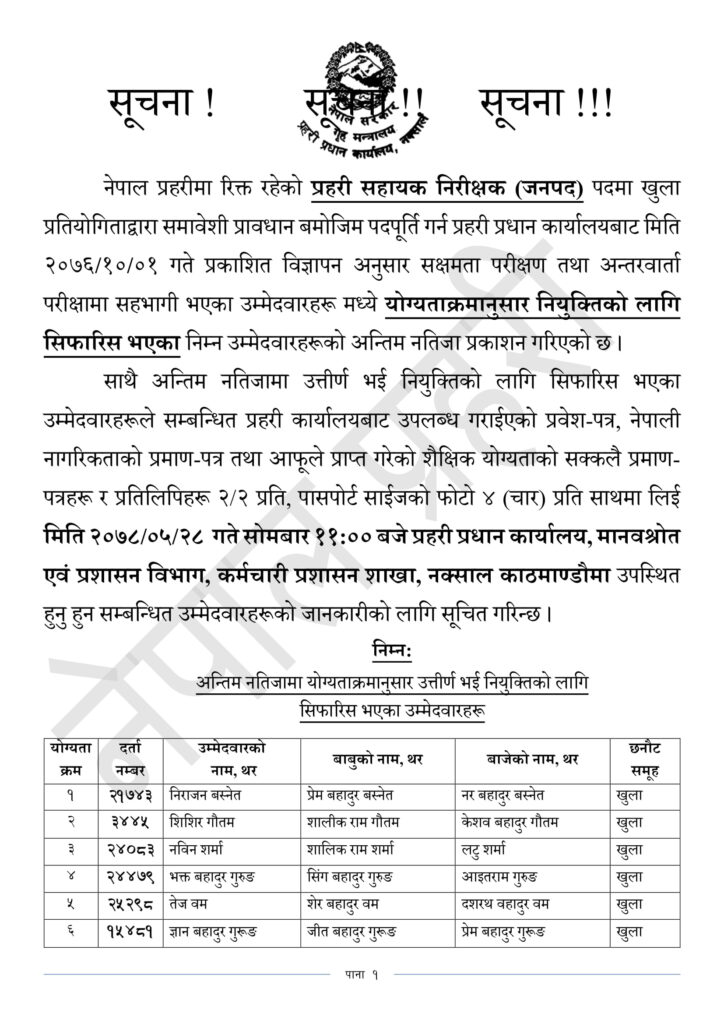 नेपाल प्रहरीका रिक्त रहेको प्रहरी सहायक निरीक्षक (जनपद) पदमा खुला प्रतियोगिताद्वारा समावेशी प्रावधान बमोजिम पदपूर्ति गर्न प्रहरी प्रधान कार्यालयबाट २०७६ माघ १ गते प्रकाशित विज्ञापन अनुसार अन्तर्वार्तामा उत्तीर्ण भएका उम्मेदवारहरूको अन्तिम नतिजा प्रकाशन गरेको सूचनामा उल्लेख छ ।