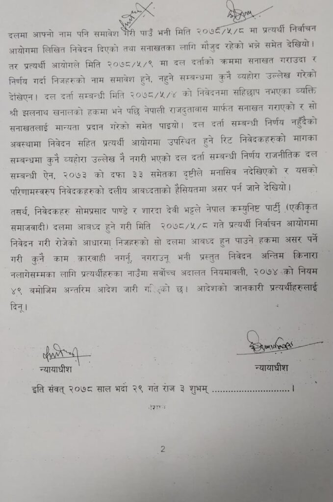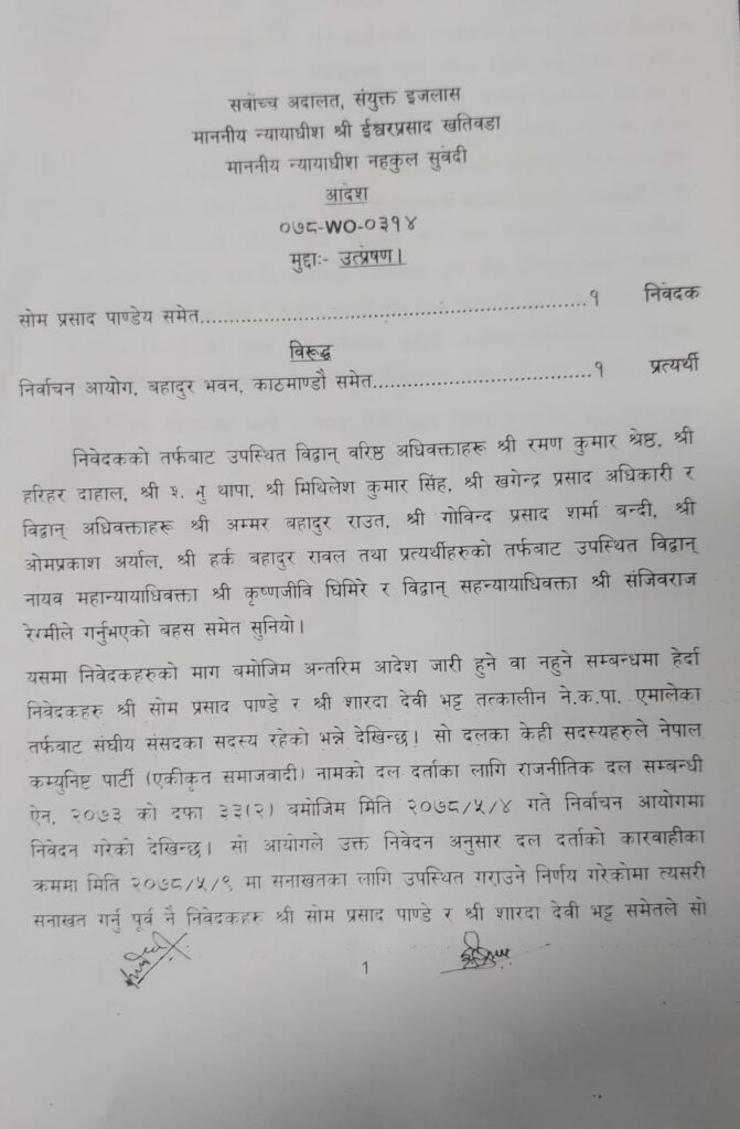 ‘निवेदकहरू सोमप्रसाद पाण्डे र शारदादेवी भट्टले नेपाल कम्युनिस्ट पार्टी (एकीकृत समाजवादी) दलमा आवद्ध हुने गरी भदौ ८ गते प्रत्यर्थी निर्वाचन आयोगमा निवेदन गरी रोजेको आधारमा निजहरुको सो दलमा आबद्ध हुने पाउने हकमा असर पर्नेगरी कुनै काम कारबाही नगर्नु, नगराउनु भनि प्रस्तुत निवेदन अन्तिम किनारा नलागेसम्मका लागि प्रत्यर्थीहरुका नाउमा अन्तरिम आदेश जारी गरिएको छ’, आदेशमा उल्लेख छ ।