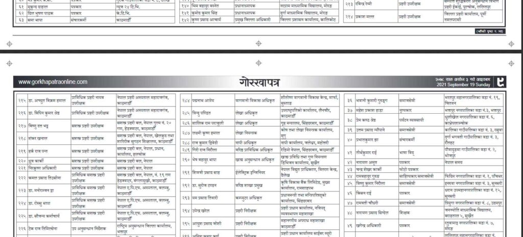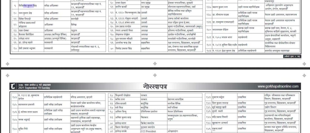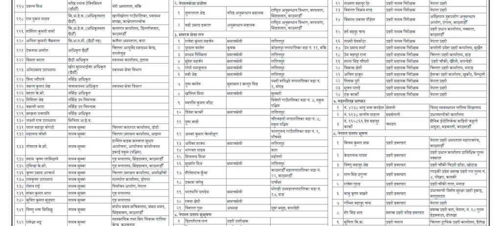 राष्ट्र यशोवद्र्धक अलङ्कार चार जनालाई, नेपाल सेवा प्रवीण दुई जनालाई, समाजसेवा रत्न २१ जनालाई, नेपाल प्रताप सुभूषण ३४ जनालाई, अतिपौरख भास्कर सात जनालाई, नेपाल प्रताप आभूषण २४ जनालाई, महापौरख भास्कर तीनजनालाई र नेपालप्रताप भूषण १६ जनालाई प्रदान गरिएको छ ।
