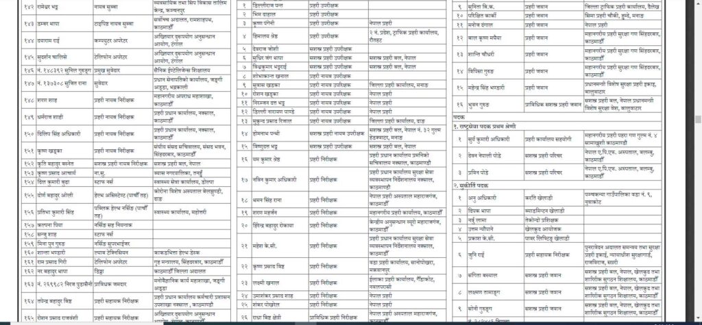 सुप्रसिद्ध प्रवल जनसेवाश्री प्रथम श्रेणी पाँच जनालाई, उज्ज्वल कीर्तिमय राष्ट्रदीप द्वितीय श्रेणी एक जनालाई, प्रसिद्ध प्रवल जनसेवाश्री द्वितीय श्रेणी २४ जनालाई, सुकीर्तिमय राष्ट्रदीप तृतीय श्रेणी ३९ जनालाई, सुप्रवल जनसेवाश्री तृतीय श्रेणी १६१ जनालाई, कीर्तिमय राष्ट्रदीप चतुर्थ श्रेणी आठ जनालाई, प्रवल जनसेवाश्री चतुर्थ श्रेणी ३१९ जनालाई र जनसेवाश्री पञ्चम श्रेणी १९० जनालाई प्रदान गरेको राष्ट्रपतिको कार्यालयले जनाएको छ ।