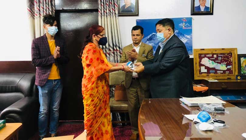 स्वास्थ्य राज्यमन्त्रीलाई वैदेशिक रोजगार व्यवसायीद्वारा ६० लाखको मास्क हस्तान्तरण