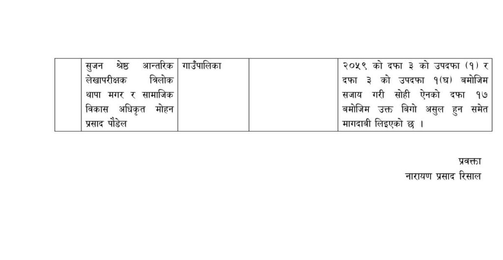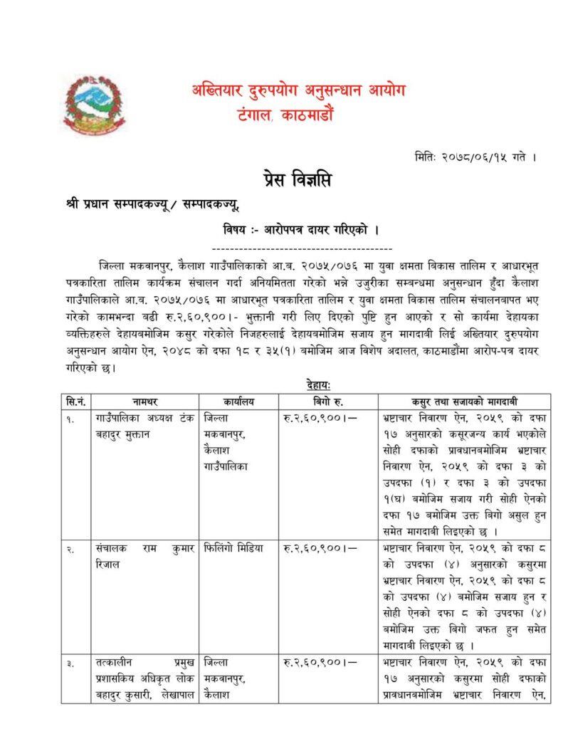 आधारभूत पत्रकारिता तालिम र युवा क्षमता विकास तालिम सञ्चालन वापत भएको गरेको कामभन्दा बढी २ लाख ६० हजार ९ सय भुक्तानी गरि लिए/दिएको पुष्टि हुन आएको भन्दै अख्तियारले सो कार्यक्रममा देहायका व्यक्तिहरूले भ्रटाचार गरेको ठहरसहित आरोपपत्र दायर गरेको प्रवक्ता नारायणप्रसाद रिसालद्वारा जारी विज्ञप्तिमा उल्लेख छ ।