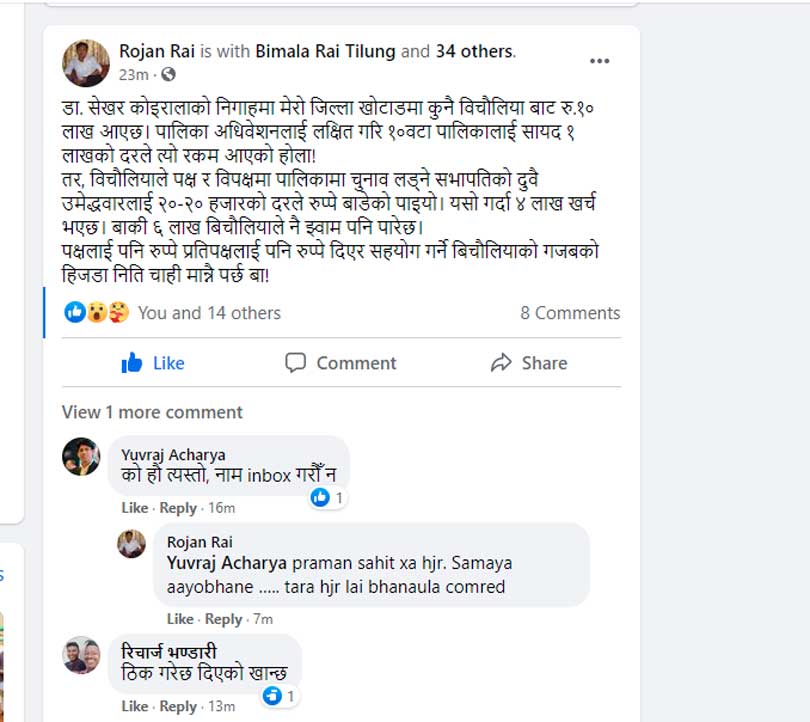 शनिबार सामाजिक सञ्जाल फेसबुकमा युवा नेता राईले लेखेका छन्, ‘डा.शेखर कोइरालाको निगाहमा मेरो जिल्ला खोटाडमा कुनै विचौलियाबाट रु.१० लाख आएछ ।’