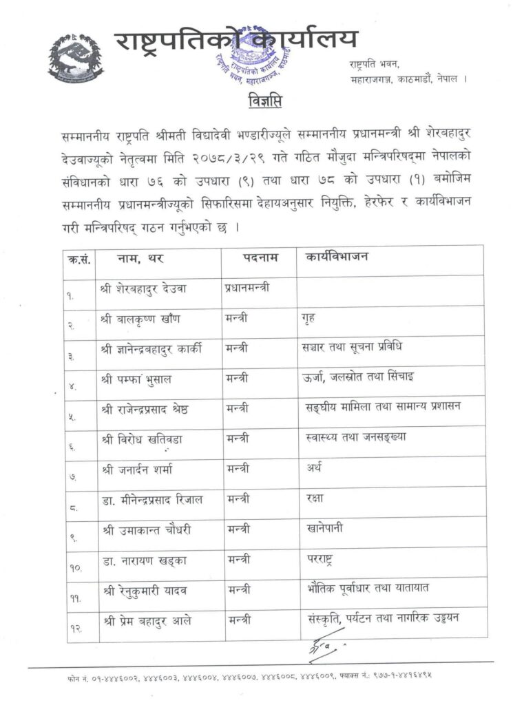 शुक्रबार देउवाले ३ राज्यमन्त्रीसहितको मन्त्रिपरिषद बनाएका हुन् । देउवाको मन्त्रिपरिषदमा कसैलाई पनि उप–प्रधानमन्त्री बनाइएको छैन ।