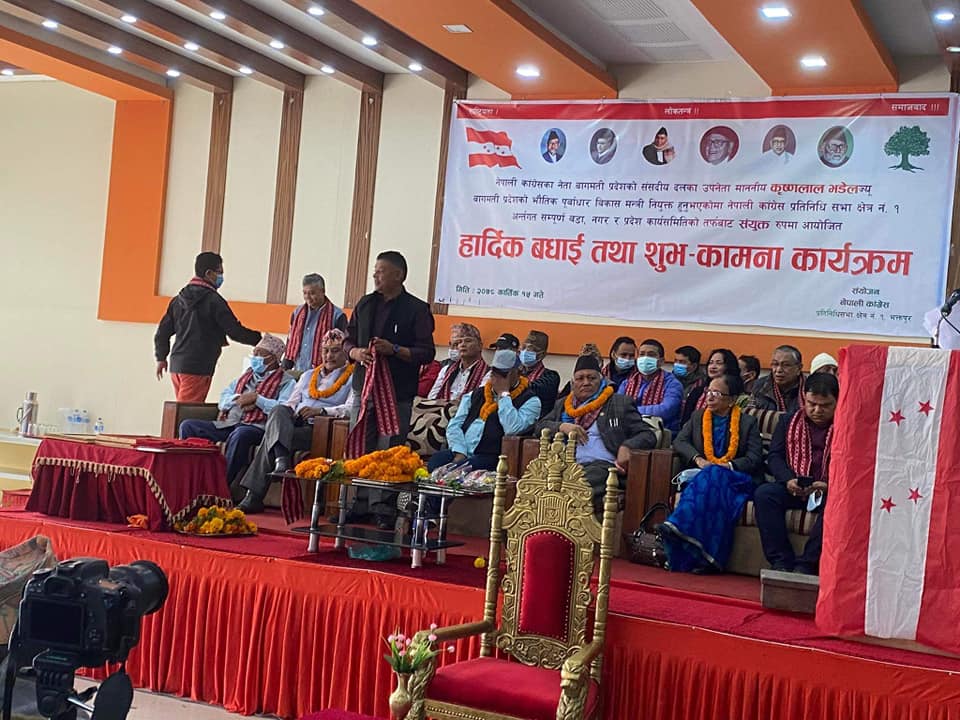 भक्तपुर । नेपाली कांग्रेस भक्तपुरले बागमती प्रदेशका भौतिक पूर्वाधार विकासमन्त्री कृष्णलाल भँडेललाई बधाई तथा सम्मान गरेको छ ।