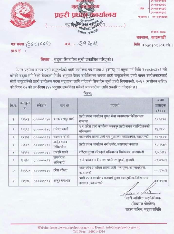 बढुवा सिफारिस हुने डीएसपीहरूमा जनकबहादुर शाही, रामेश्वर कार्की, चक्रराज जोशी, अर्जुनप्रसाद तिमिल्सिना, रामहरि पाण्डे, लक्ष्मीराज अधिकारी, रमेश पण्डित र अर्जुन रानाभाट रहेका छन् ।