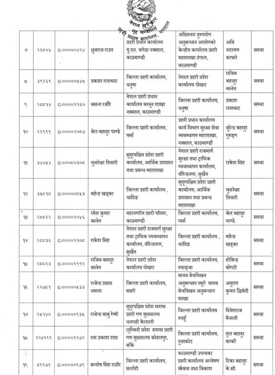 रमेशकुमार बस्नेतलाई जिल्ला प्रहरी कार्यालय पर्सा सरुवा गरिएको छ । मकवानपुरमा कार्यरत सोमेन्द्र सिंह राठोरलाई युएन जगेडा कोषमा सरूवा गरिएको छ ।