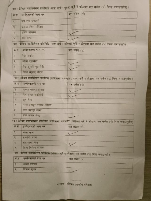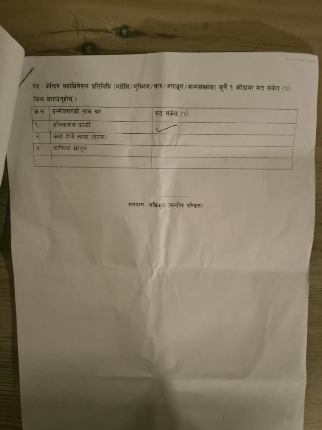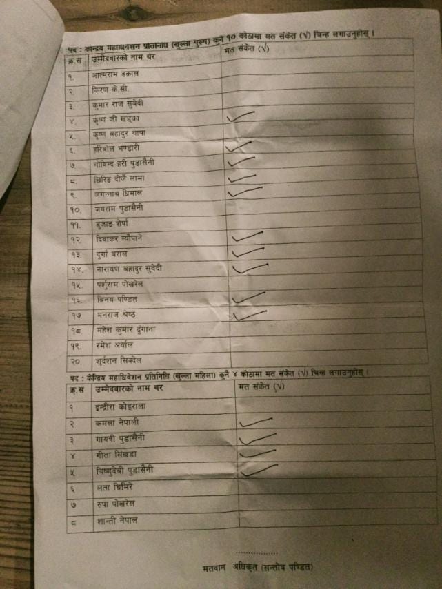 अधिवेशनमा करीव ५५ मत खसेको थियो । सभापतिका उम्मेदवार लामाले डुप्लिकेट मतपत्र देखेपछि सबैको सहमतिमा अधिवेशनको निर्वाचन प्रक्रिया मंगलबार बिहान ८ बजेसम्म स्थगित गरिएको बताए ।