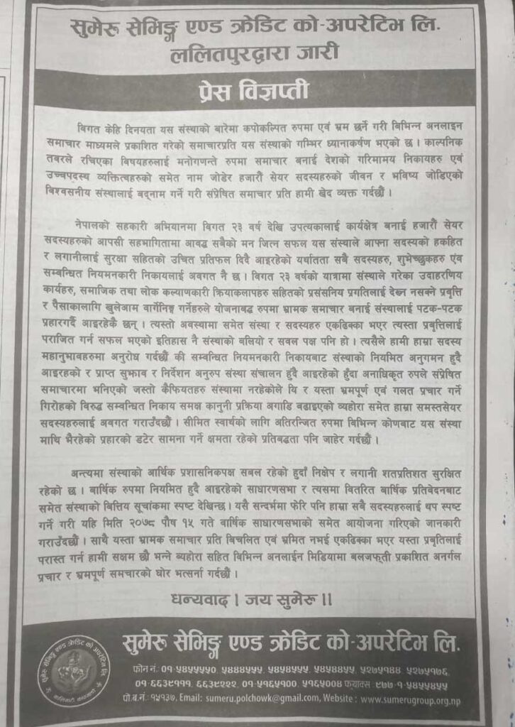 राष्ट्रिय दैनिक पत्रिकाहरूमा पैसा तिरेर विज्ञप्ति निकालेर सुमेरुले सहकारीविरुद्ध आएका समाचारमा कुनै सत्यता नरहेको जनाएको हो ।