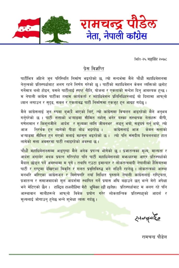 जीवनभरि कोइराला परिवारको ‘चाकडी’ र संरक्षणमा विताएका पौडेलले शनिबार विज्ञप्ति जारी गरेर १४औँ महाविधेशनमा नेतृत्वको प्रतिस्पर्धाबाट अलग रहने निर्णय गरेको जनाएका छन् । ‘पार्टीभित्र अहिले जुन परिस्थिति निर्माण भइरहेको छ, त्यो सन्दर्भमा मैले चौधौँ महाधिवेशनमा नेतृत्वको प्रतिस्पर्धाबाट अलग रहने निर्णय गरेको छु’, विज्ञप्तिमा उल्लेख छ ।