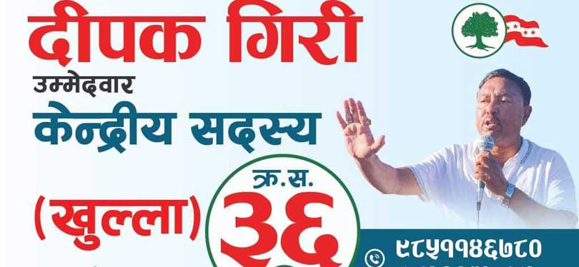 काठमाडौं । नेपाली कांग्रेसका नेता एवम् पूर्वमन्त्री दीपक गिरीले आफूलाई ३५ जना केन्द्रीय सदस्यको खुलातर्फ क्रम संख्या ३६ मा मतदान गर्न अपील गरेका छन् ।