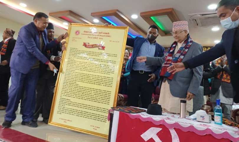 एमालेको झापा जिल्ला कमिटीले ओलीलाई अभिनन्दन गरेको हो । झापाबाट निर्वाचित स्थायी कमिटी, पोलिटव्यूरो र केन्द्रीय सदस्यहरूलाई सम्मान गरिएको छ ।